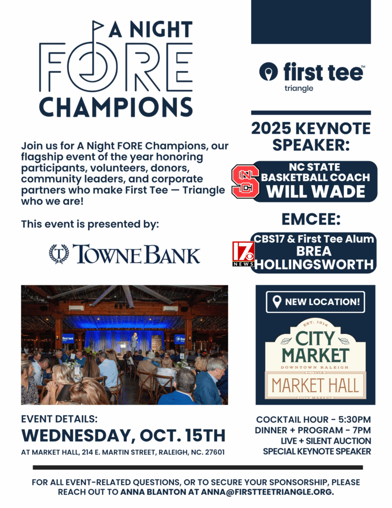 Join us for A Night FORE Champions, our flagship event of the year, now at an exciting new venue, Market Hall in Downtown Raleigh, on October 15th, 2025. This special evening honors the participants, volunteers, donors, community leaders, and corporate partners who make First Tee – Triangle who we are!