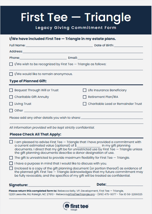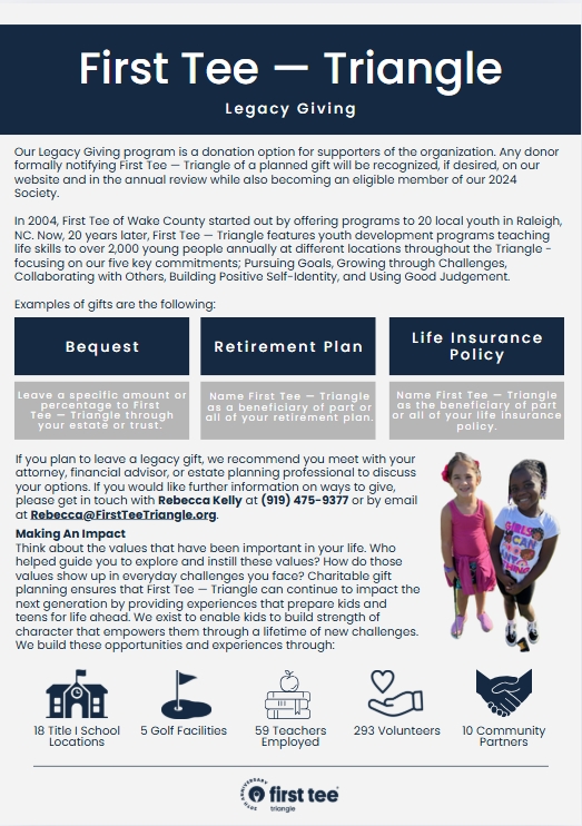 Legacy giving, also known as planned giving, allows donors and community members to leave a lasting impact by including charitable donations in their estate plans. Examples of legacy giving include bequests in wills, charitable trusts, life insurance policies, and retirement accounts. First Tee — Triangle is excited to announce the launch of our legacy giving option, inviting individuals and families to consider leaving a gift of any size in support of our mission. Whether through individual donations, family legacies, or other means, every contribution helps us continue our work of empowering youth through golf and life skills education.