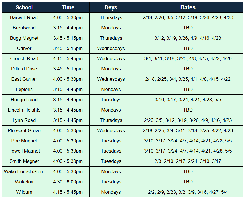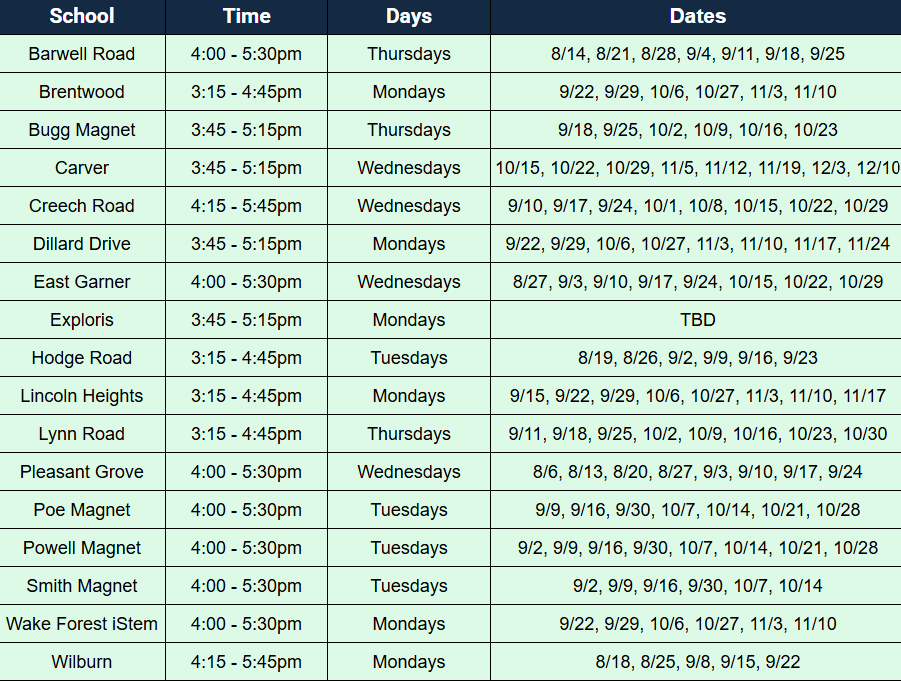 *Note: Students may only participate in the program at the school where they attend. For example, Brentwood students cannot participate in Creech Road’s program.
