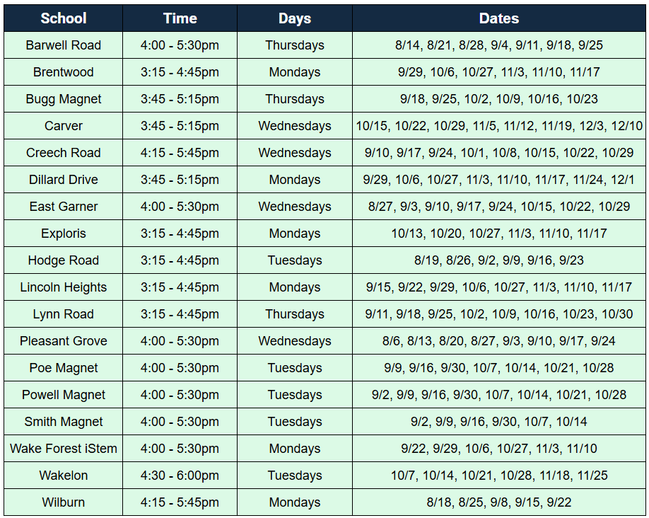 *Note: Students may only participate in the program at the school where they attend. For example, Brentwood students cannot participate in Creech Road’s program.