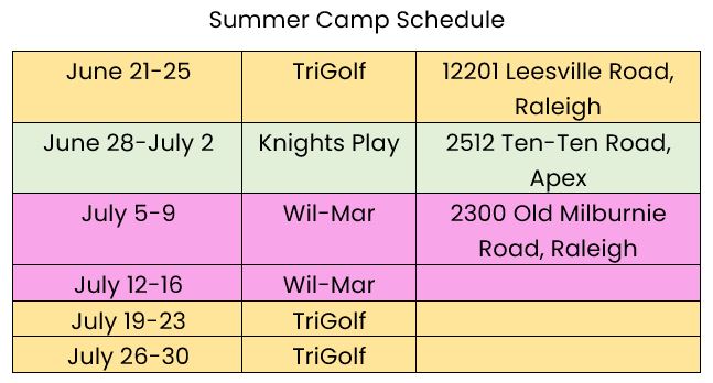 On the Fridays of the weeks that we are at TriGolf, we will meet at Falls Village at 7:30. Kids will tee off the back nine at 8:00am. Pick up is still 1pm.