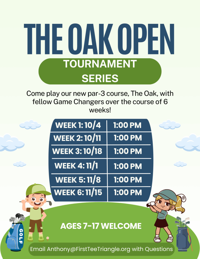 The Oak Open is a fall-long tournament that gives First Tee – Triangle participants the opportunity to compete against one another in a 9-hole stroke play format at The Oak Par-3 Course in Raleigh. In order to qualify for the tournament, participants must play in a minimum of 3 weeks. Subscribe to our newsletter for updates by emailing Anthony Lueck ([email protected])
